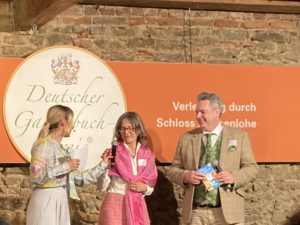 Süsskind et ainsi le jury indépendant vont avec les temps modernes incluant aussi le self-publishing, immense monde littéraire populaire, écologique et parallèle. – Auteurs et éditeurs tournent autour de la longue table en bois où s’entassent des centaines de livres. Aucun indice n’indique les gagnants. Grande est la joie, quand Bettina de Cosnac, journaliste, écrivaine, fondatrice et éditrice de monumentum-nostrum.com, se trouve soudainement appelée au podium pour son dernier roman « Palmen und Zitronen » (Hamburg, 2026). Ce roman intergénérationnel met Nice et les parcs et jardins de la Côte d’Azur à l’honneur. Un peu de crime, un peu d’amour et un peu plus de savoir. Une lecture enrichie par un mini-dico franco-allemand de la Riviera botanique dans l’annexe. L’originalité de l’histoire et cette idée finale ont plu. Au plaisir de l’écrivaine. Si la baronne Süsskind porte la casquette de thérapeute des jardins, elle sait qu’ écrire sur les jardins, est une autre forme de thérapie. Elle aussi publie des beaux livres sur son parc et les jardins en Bavière.