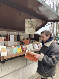 A Paris, un patrimoine considéré « immatériel » est pourtant bien réel depuis 475 ans. En effet, c’est en 1550 que les premiers marchands d’imprimés s’installent près de la Seine. En novembre 2025, ils fêtaient leur anniversaire. L’un des plus jeunes bouqinistes est Melchior. Issu d’une famille de militaires d’origine espagnole, avec un nom à particule qu’il ne faut pas mentionner, il a conquis le marché des bouquinistes à l’âge de 26 ans. Il s’installa aux bords de la Seine en 2024, juste après les Jeux Olympiques à Paris. Depuis, il a déménagé sa boutique ambulante par trois fois. Car si l’on achète les « boîtes » et la cession d’un autre bouquiniste, c’est la mairie de Paris qui vous assigne votre place. « Mais c’est toujours aussi beau et le long de la Seine. On est au cœur même de Paris. » Installé au Quai Voltaire, il aime sa vue vers le Louvre et le Petit Palais. Il contemple l’eau, s’il ne contemple pas les passants et ses livres. Ce qui l’intéresse dans ce métier? « C’est la liberté ». Il ouvre quand il veut. Et « c’est du concret »